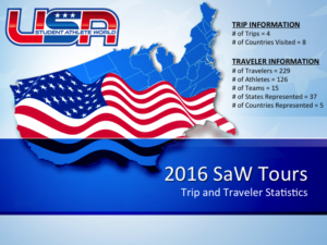We are happy to announce our 2016 trip and traveler information. This summer we will take 229 travelers (15 teams with 126 athletes) from 37 different states and 5 different countries around the World on 4 trips covering 8 countries. Join the adventure #SaWTeamUSA.