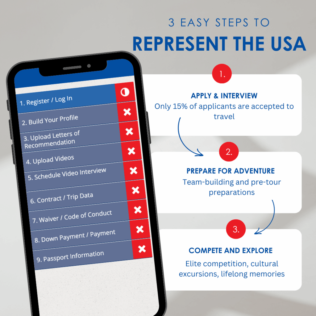 The first step is to apply. Only 15% of applicants are accepted to travel. We are looking for talented, dedicated, and well-rounded young people to serve as athlete ambassadors of the USA. Our application process walks you through everything you need to do to be accepted to travel. Once accepted the tour preparations begin. Our staff and coaches will handle everything you need to prepare for your adventure. Our tours are all-inclusive: flights, hotels, meals, excursions, sports activities—one price, no surprises. Want more information? Our FAQ page is a great place to start.